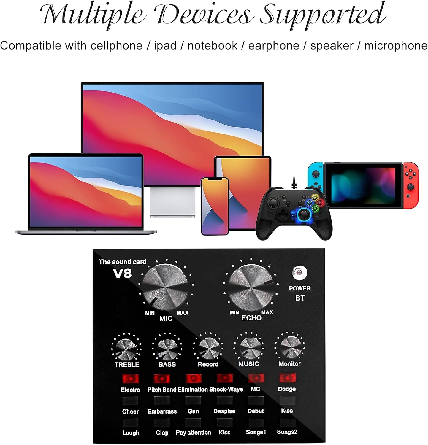 • 【V8 sound card】: With low power consumption and high computing performance, the sound quality is fresher and more stable, making the sound more three-dimensional and rounded. 12 interesting sound effects, so you are not embarrassed in the live broadcast, helping you to easily heat up the atmosphere of the live broadcast.